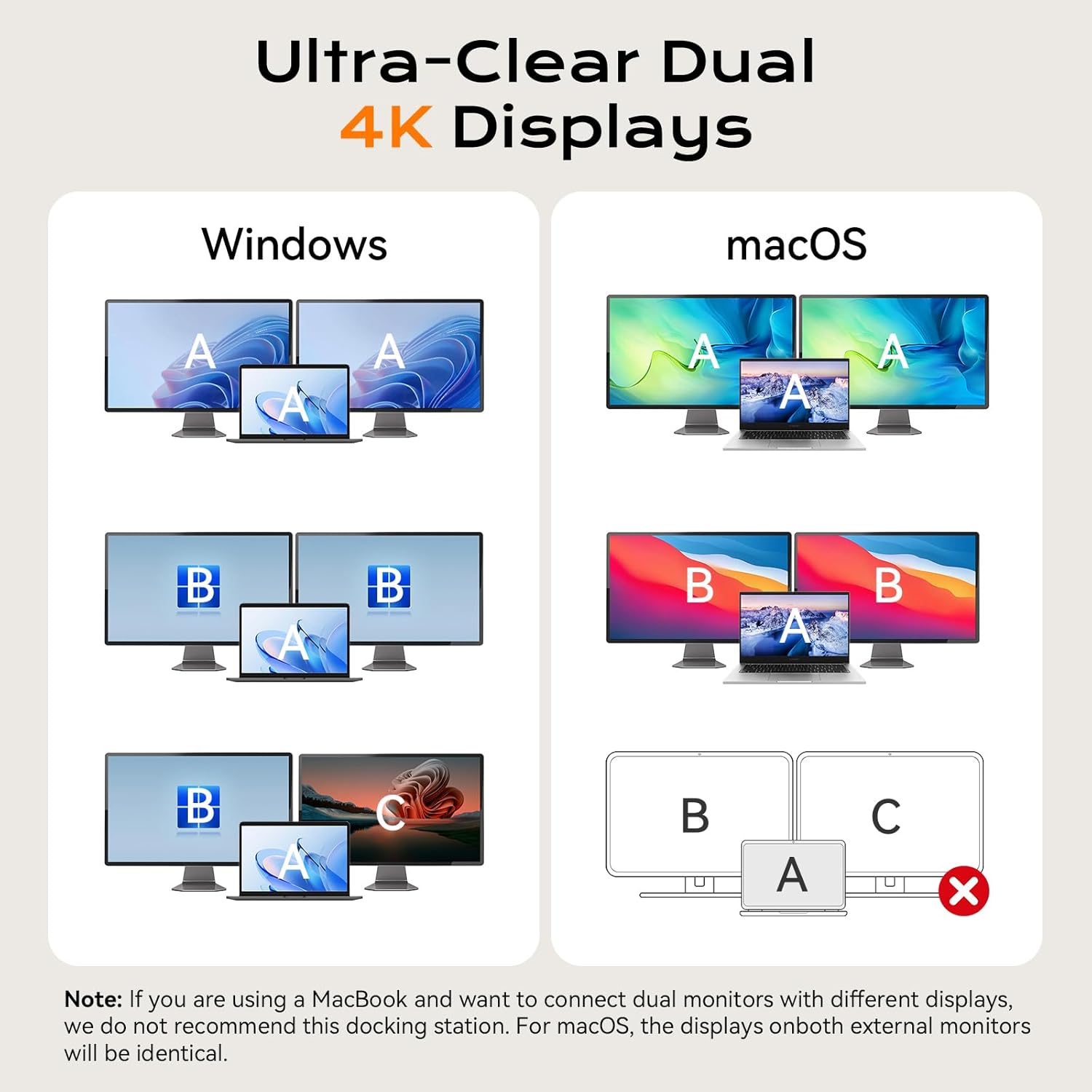 Dual 4K Monitor Support for Boosted Productivity: Work Smarter on Two Screens. Laptop Docking Station Dual Monitor expand your workspace with 2*HD ports (4K@60Hz HDR), supporting extended/duplicate display modes for multitasking. Perfect for financial analysts, designers, and remote workers needing extra screen real estat