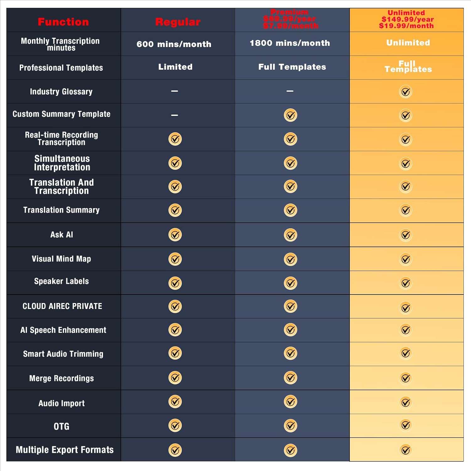 【Free AI Membership Plan】All users can enjoy 600 minutes of advanced AI-driven transcription and summarization services for free each month. Note: Once you activate your AIREC, you will receive a one-year free launch plan, including 600 minutes of transcription time per month. If you need more time, you can subscribe to the Premium plan($69.99/year, $7.99/Month)which including 1800 monthly AI transcription & summary minutes or Unlimited Plan($149.99/year, $19.99/Month)which including no unlimited duration.