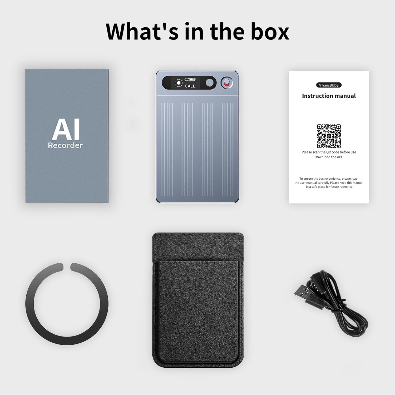 Package Includes: 1 x Portable Note Voice Recorder, 1 x Black Protective Case, 1 x Magnetic Ring, 1 x Magnetic Charging Cable, 1 x Instruction Manual.