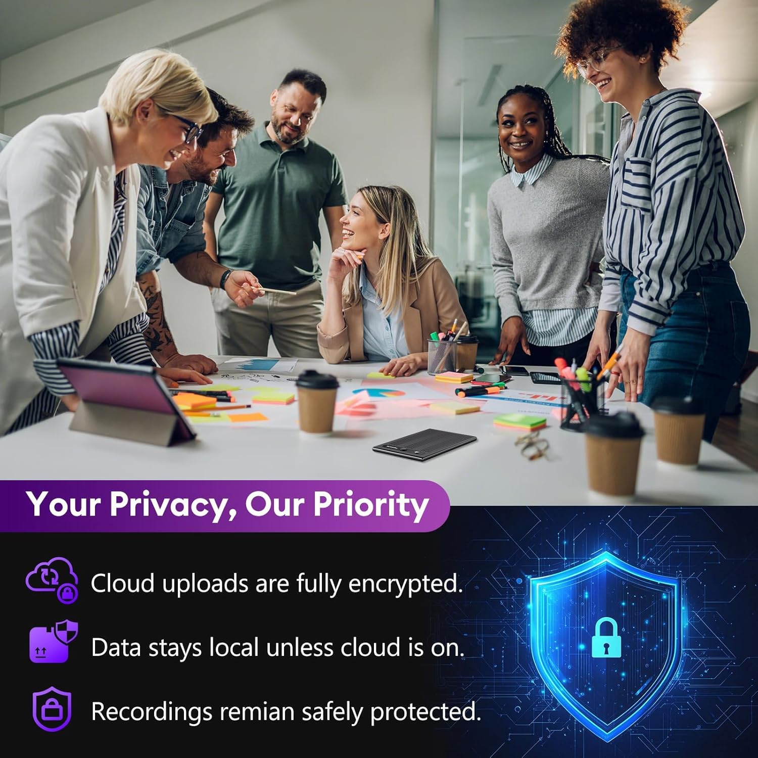 Massive Memory & Privacy Protection:AI Recorder doesn’t require an SD card. The recordings are first encrypted by the ai note recorder’s hardware, and then encrypted again before being uploaded, thus protecting your privacy in all aspects