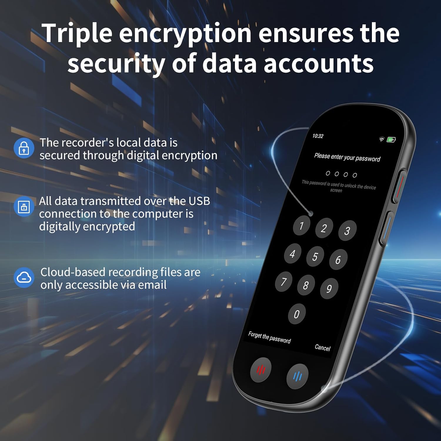 【Multiple Encryption Technologies】Ensure your device remains secure with lock screen encryption, requiring a six-digit password for verification before unlocking and operating the device. Enhance teamwork efficiency by easily sharing recordings, transcriptions, and summaries through built-in transcription and summary features.