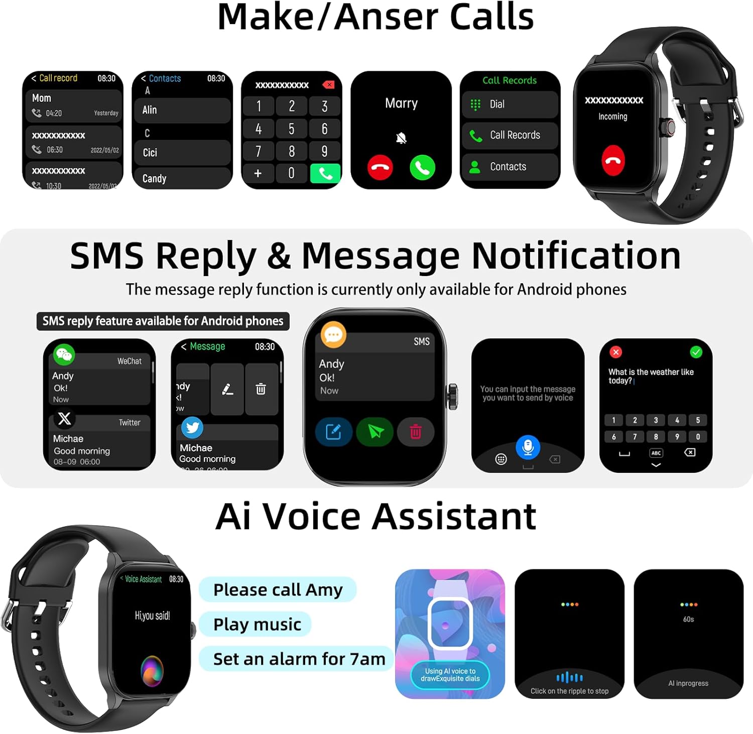 Call & SMS Reply & Message Alert – This bluetooth smart watch can be used to make/receive calls, add contacts and view call history; supports messaging and social media notifications (Facebook, WhatsApp, Instagram, Twitter, etc.);supports voice-to-text quick reply to send SMS(Android system available)